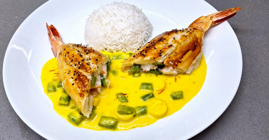 Feuilleté mit grossen Crevetten grünem Spagel und Palmito