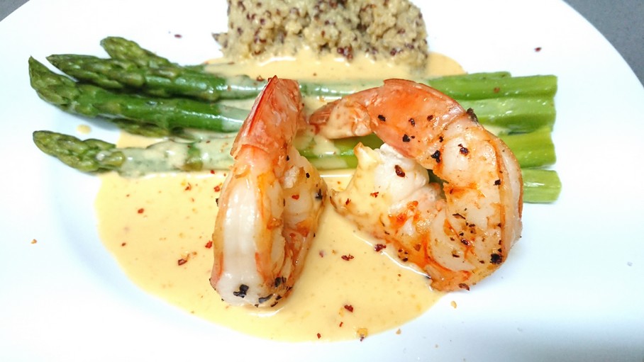 Gebratene Crevetten auf grünem Spargel mit Tomyandaise Sauce