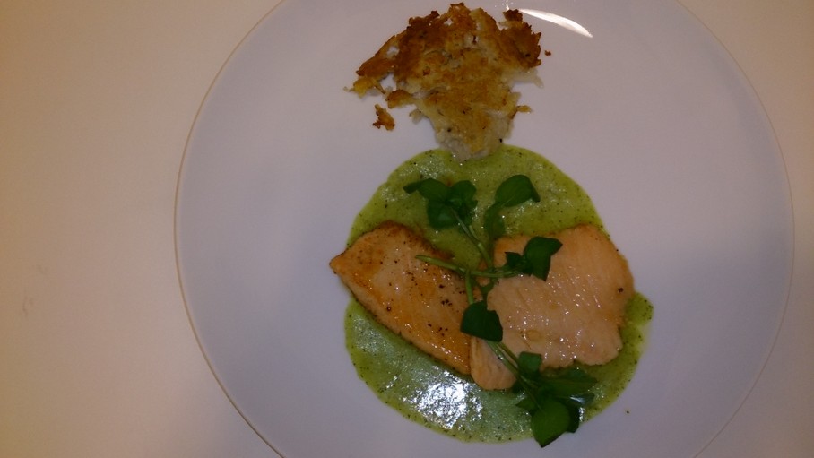 Lachsschnitzel auf Brunnkresse Sauce mit Yam-Rösti