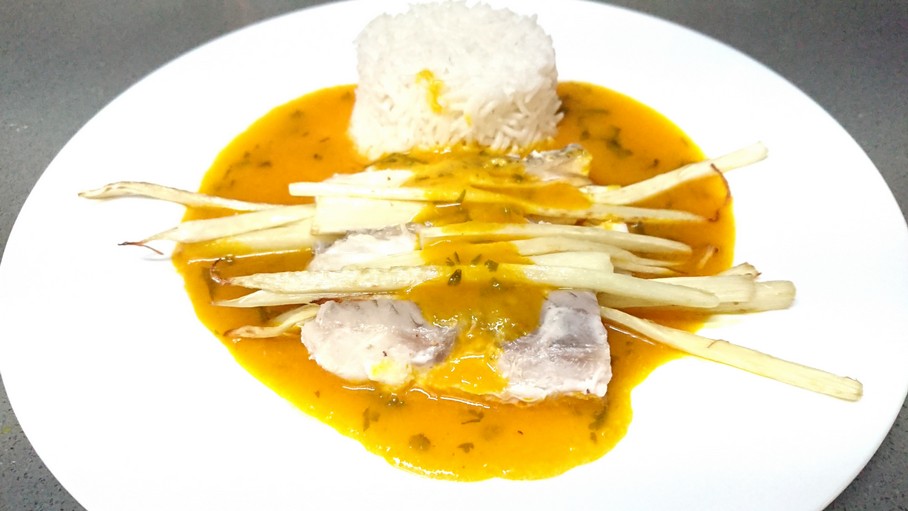 auf einer dicken Sauce mit dem Öl der Dendé-Palme, Maniok-Mehl und Kokosmilch
