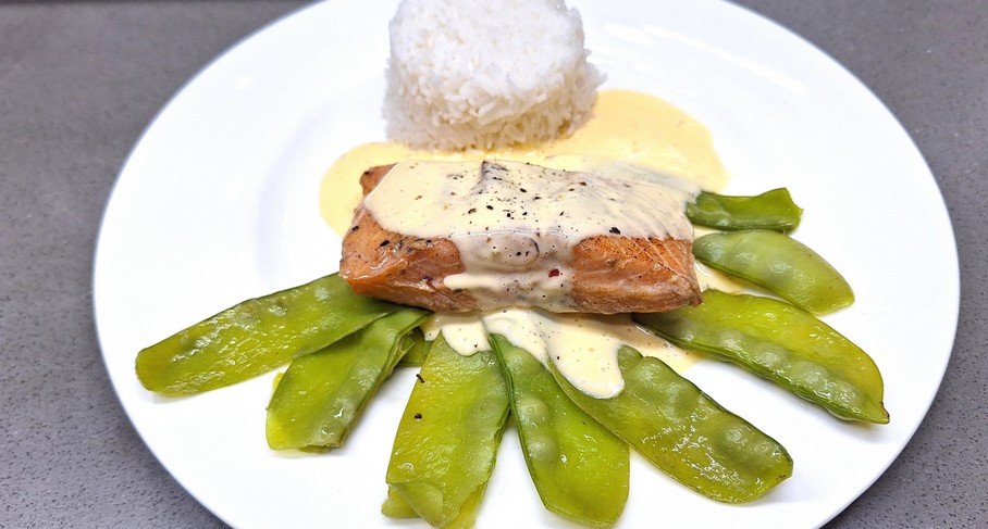 Lachs sous-vide gegart, geflämmt mit Pfeffer Hollandaise