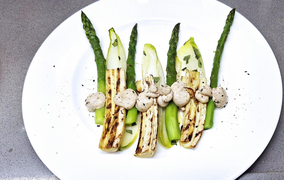 grüner Spargel, gegrillte Palmitos und gedämpfter Endivian