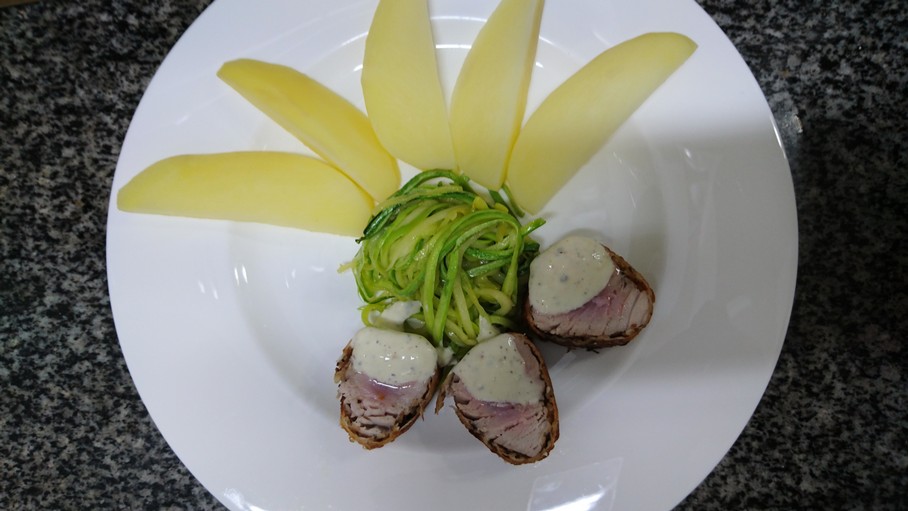mit Zucchetti Spaghetti und Wasabi-Sauerrahm-Mayonnaise