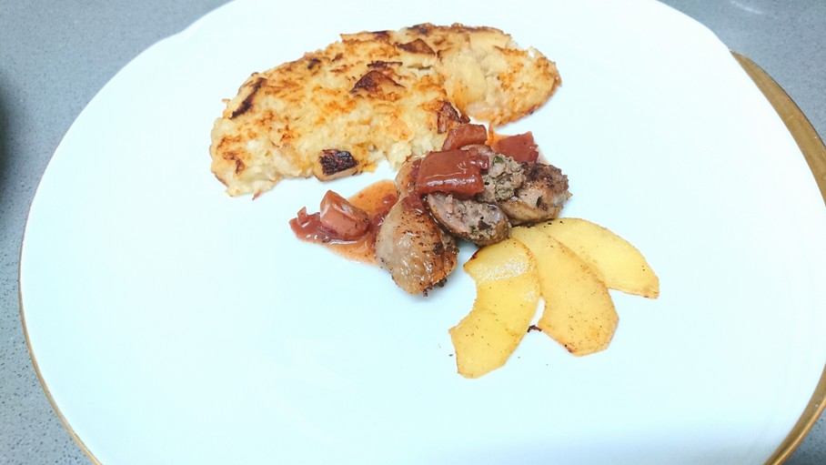 an einer Portwein- Apfel Sauce mit Apfelrösti